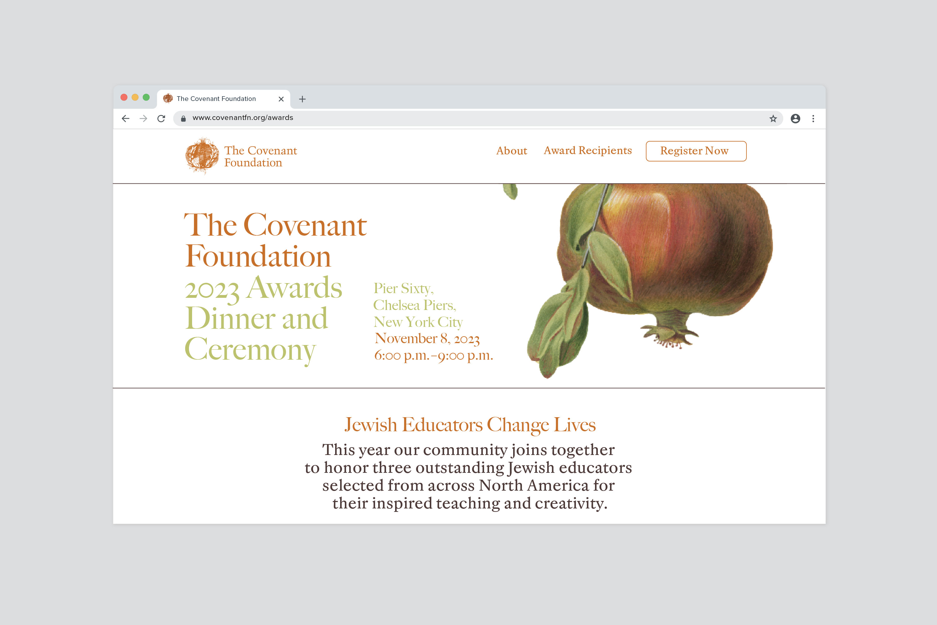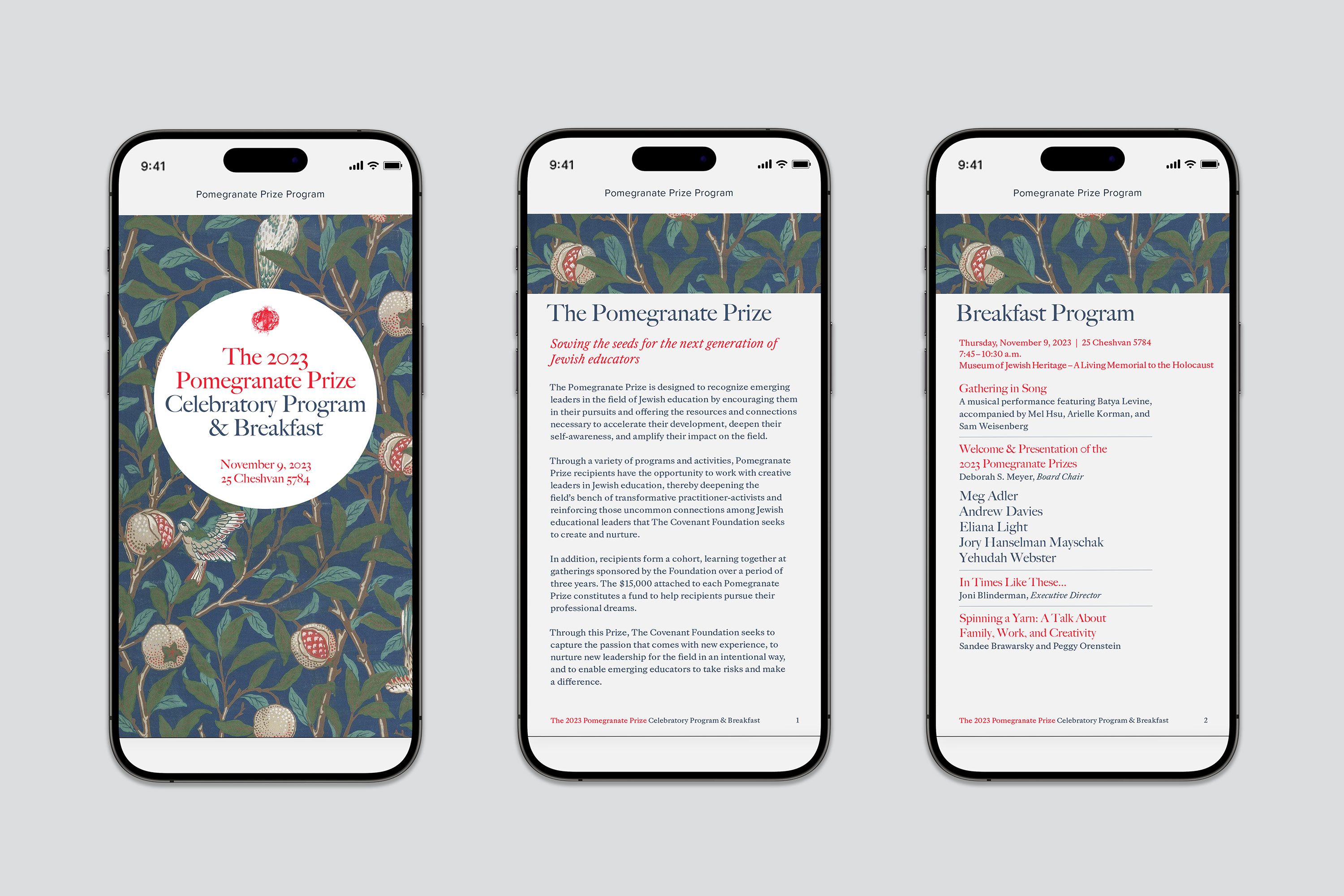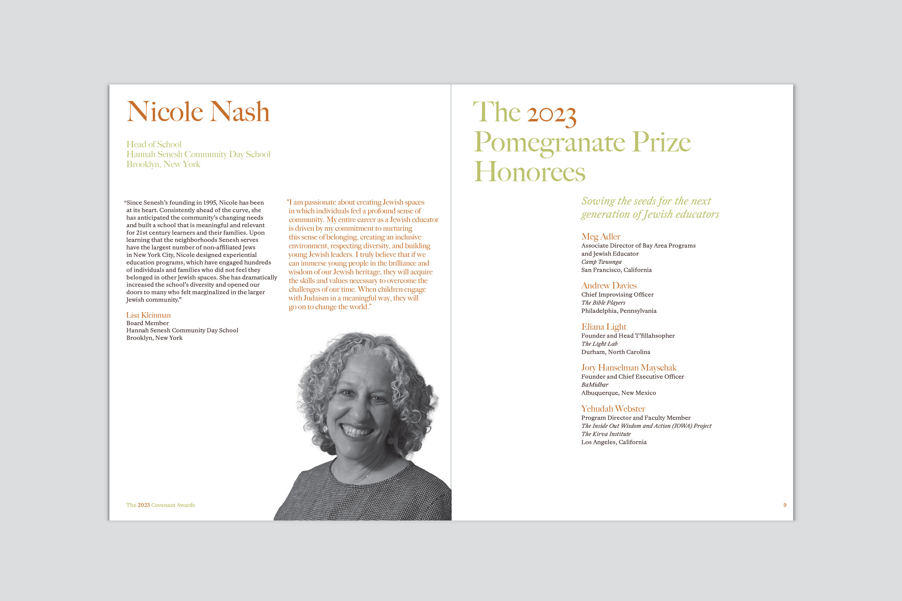 The Covenant Foundation works to promote education that supports the identity, continuity and heritage of the Jewish people. Each year, The Covenant Foundation honors 3 exceptional Jewish educators with a prestigious Covenant Award and 5 emerging Jewish leaders with the Pomegranate Prize Award. Pure+Applied worked with the Covenant Foundation to design material for both the 2023 awards which included; graphic identity and system design, event programme (both print and digital), website design and digital assets.