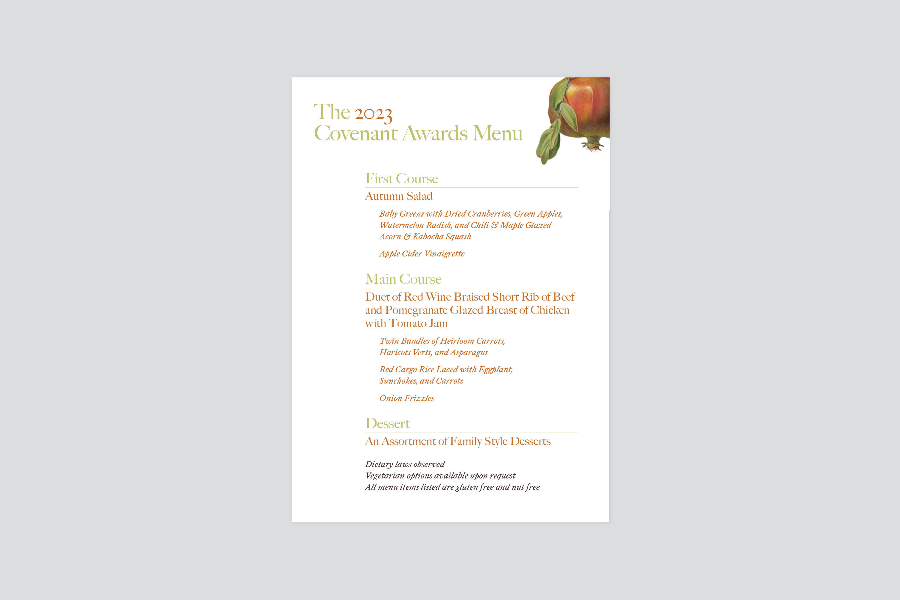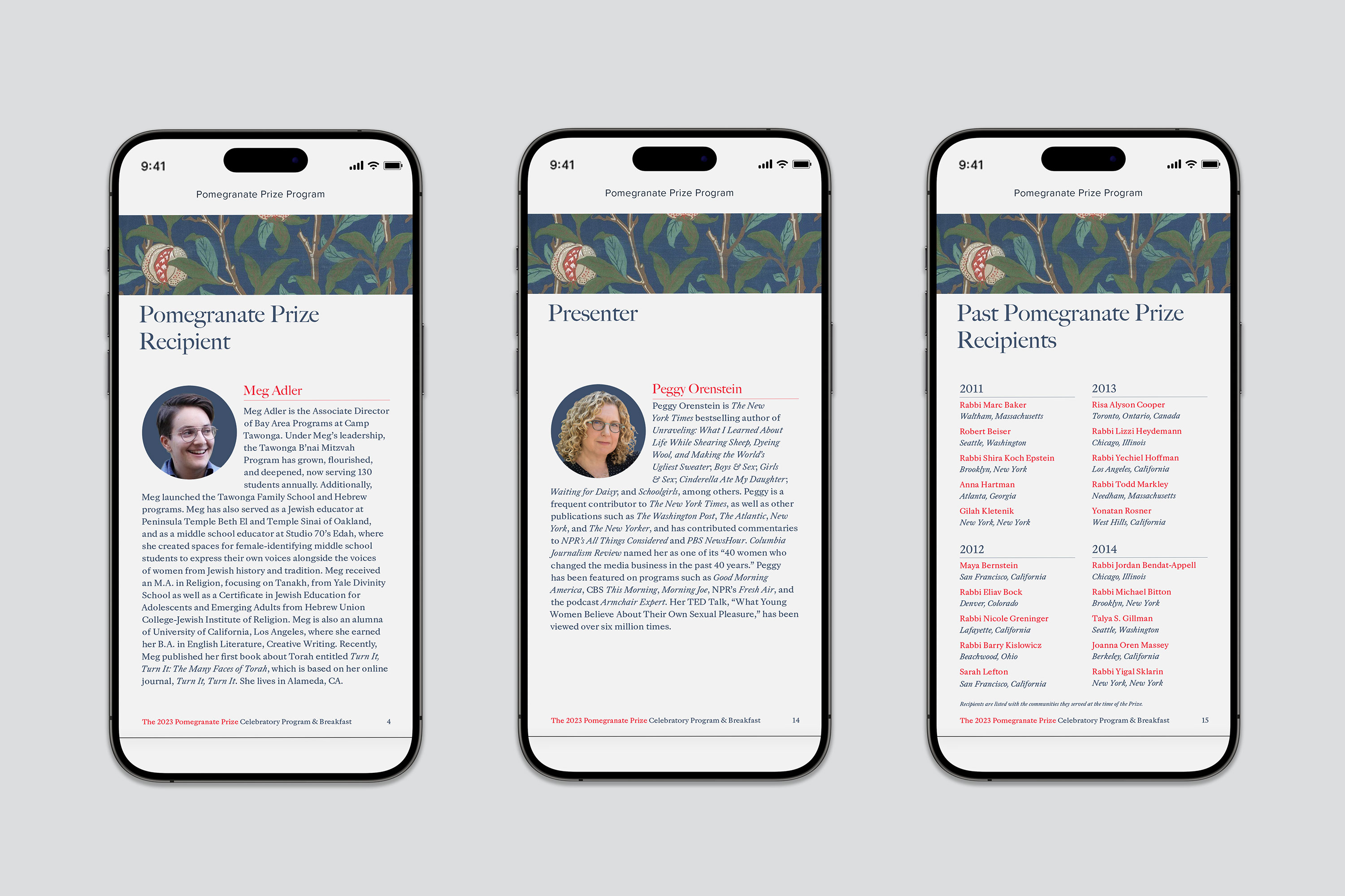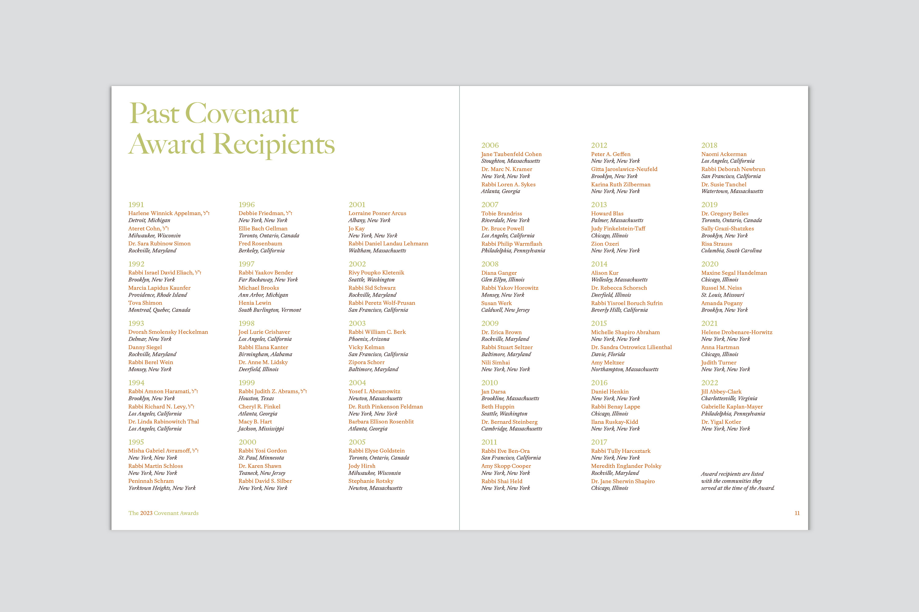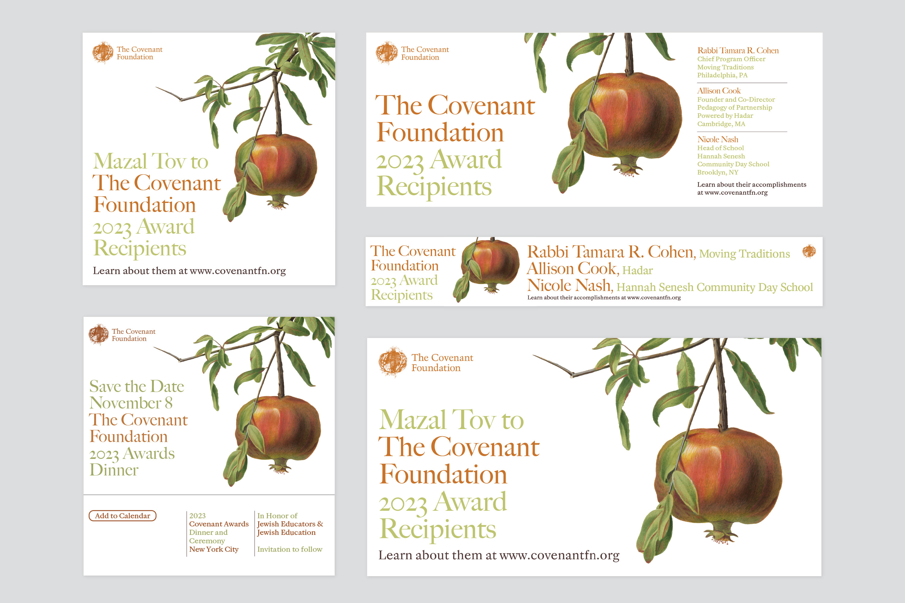 The Covenant Foundation works to promote education that supports the identity, continuity and heritage of the Jewish people. Each year, The Covenant Foundation honors 3 exceptional Jewish educators with a prestigious Covenant Award and 5 emerging Jewish leaders with the Pomegranate Prize Award. Pure+Applied worked with the Covenant Foundation to design material for both the 2023 awards which included; graphic identity and system design, event programme (both print and digital), website design and digital assets.