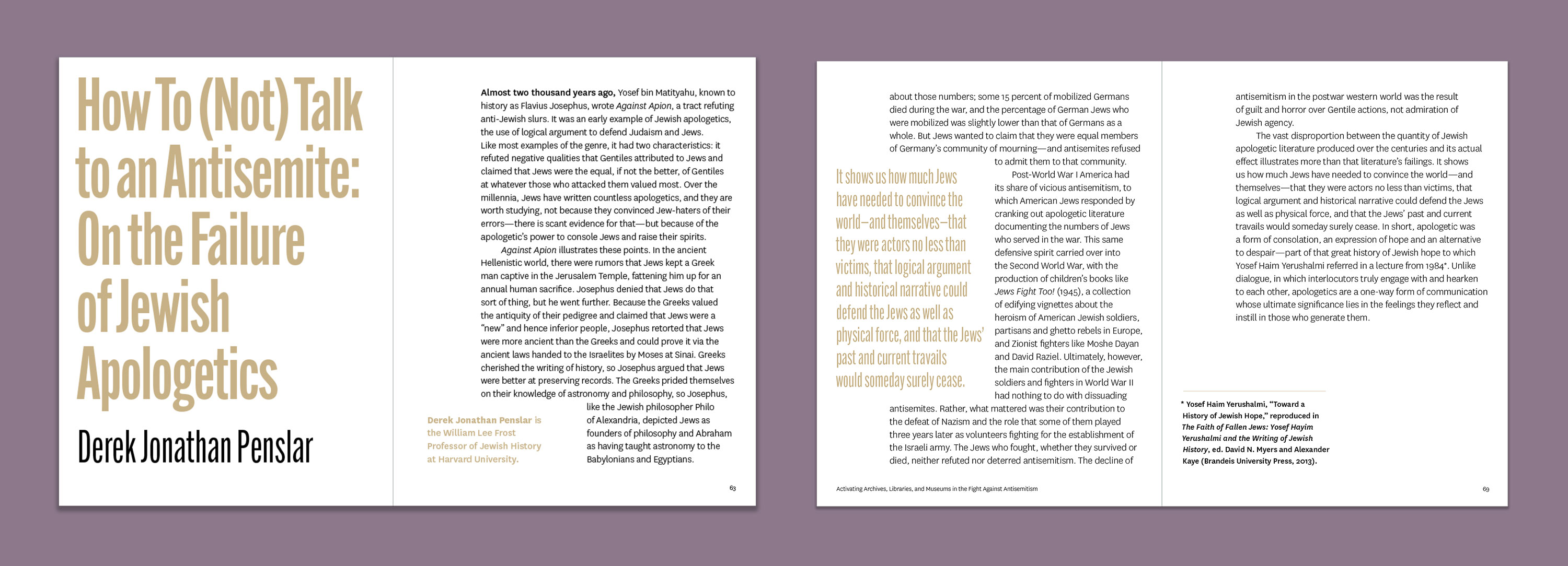 jMUSE is an arts and culture venture founded on and committed to the principles of collaboration and exchange of resources. From exhibitions to conferences and symposia to publications — jMUSE aims to bring together institutions, experts, and philanthropists to experiment with new ways to present important ideas and innovative content. Pure+Applied worked with the jMUSE to design a graphic identity and a publication in collaboration with the Center for Jewish History.