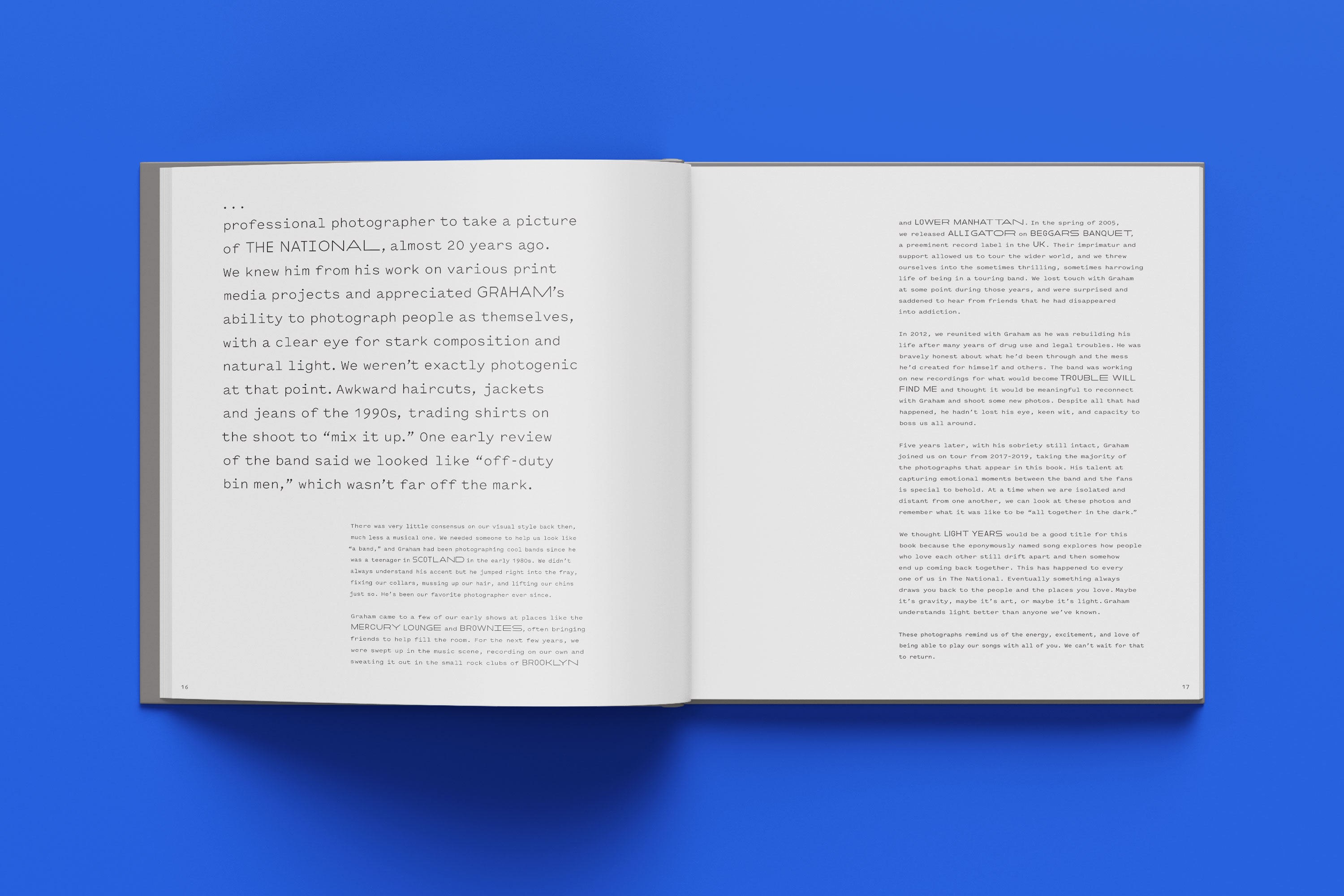 Light Years is a book which features photographs of rock band, The National, taken by Graham MacIndoe. The photographs include; portraits, concerts, rehearsals and recording sessions. Graham’s black-and-white photographs provide a unique and intimate view of the band’s interactions with each other, their crew, family, friends and fans. The book also features essays, band member quotes and comes in a custom box with a 12” vinyl of songs from the bands 2018 performances at Forest Hills Stadium. This project was a collaboration with Graham MacIndoe, The National and Pentagram partners Abbott Miller and Luke Hayman.
