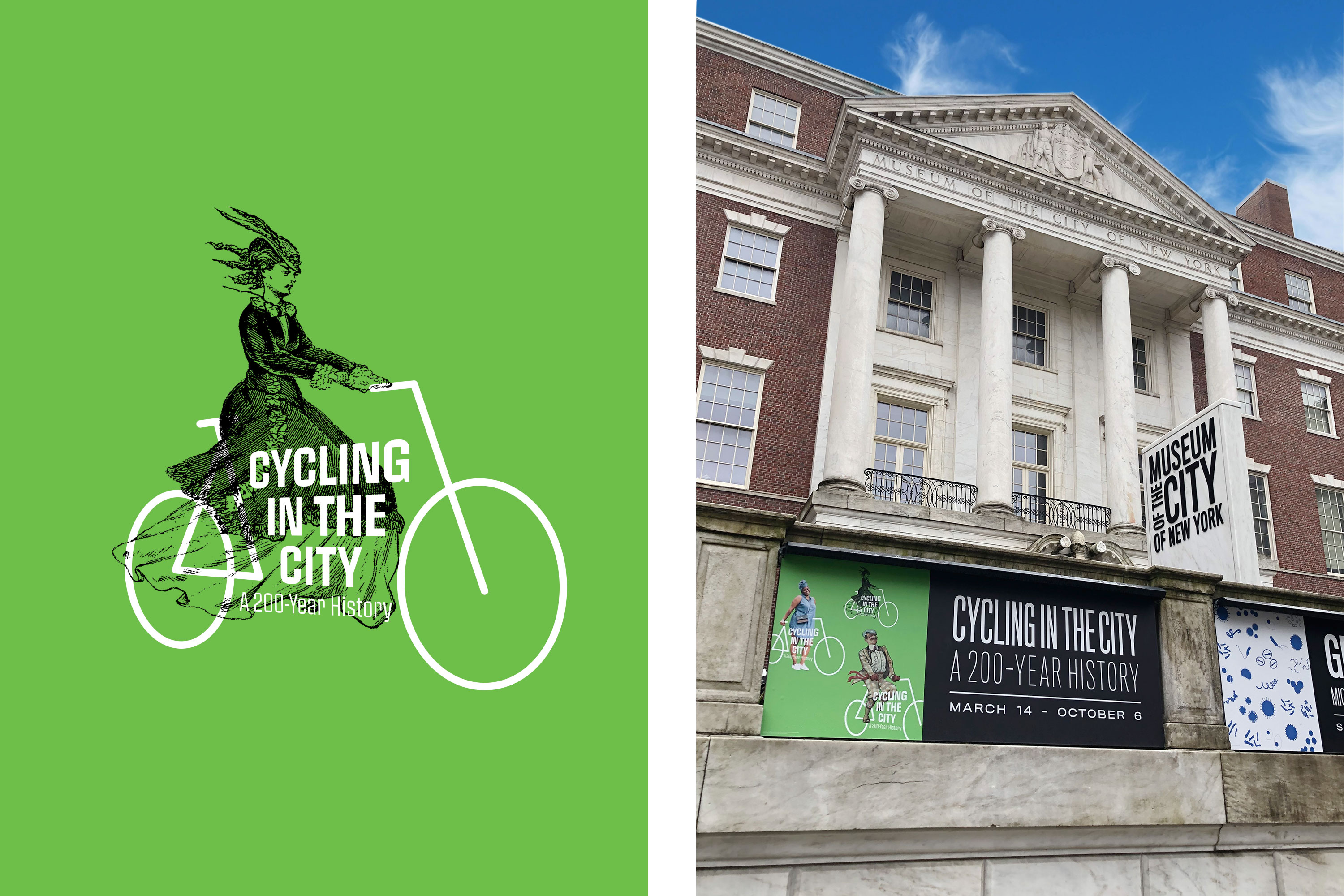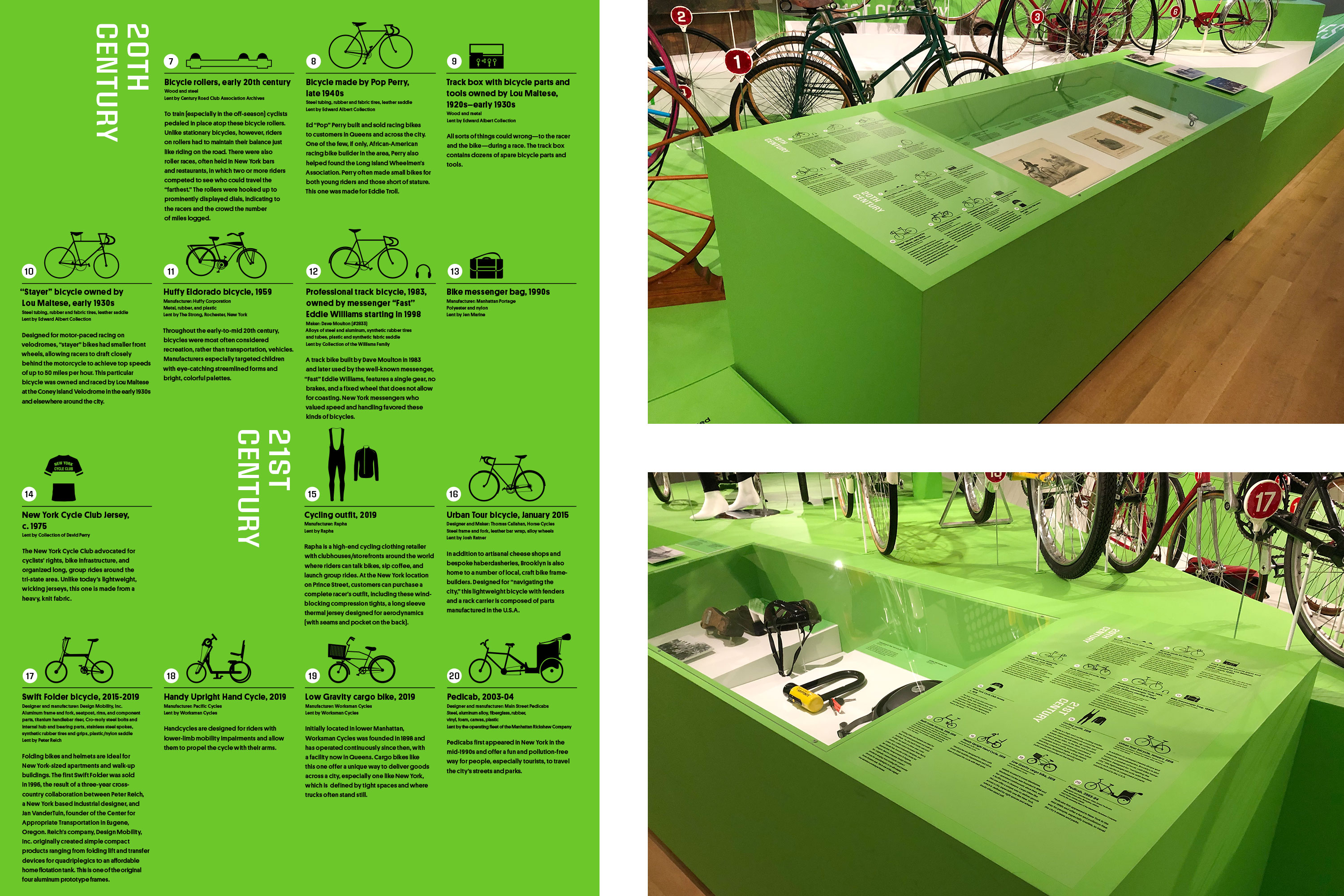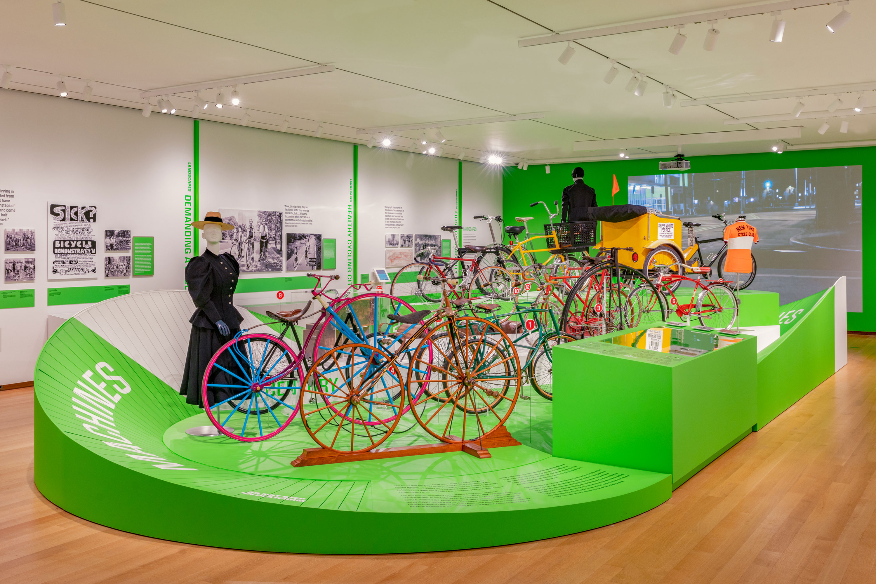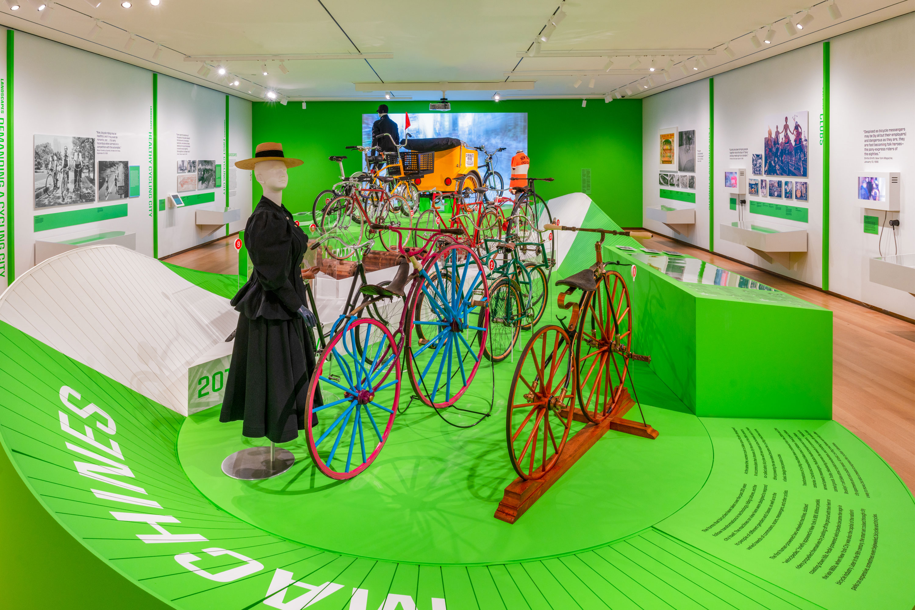 Cycling in the City: A 200-Year History was a temporary exhibition at the Museum of the City of New York which ran from March – October, 2019. The exhibition showcased more than 150 objects which included; bikes, related apparel and printed ephemera which revealed the complex, creative, and often contentious relationship between New York City and the bicycle. Pure+Applied worked with the MCNY team across different elements of the exhibition including; conceptual development, floorplan and elevation design, case layouts, graphic identity and system design, exhibition graphics and installation. The central structure resembles a historic velodrome which showcases the 14 bikes.