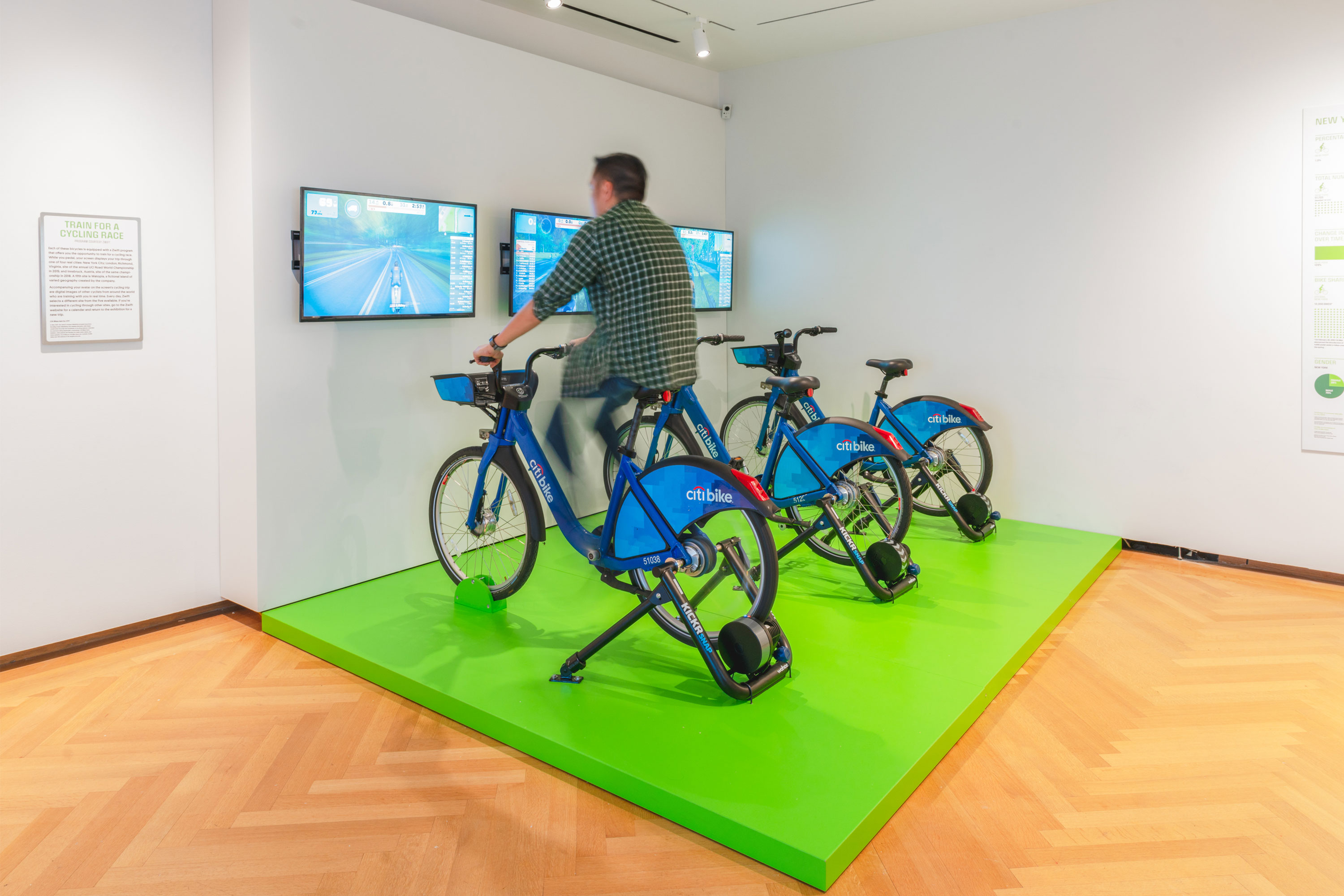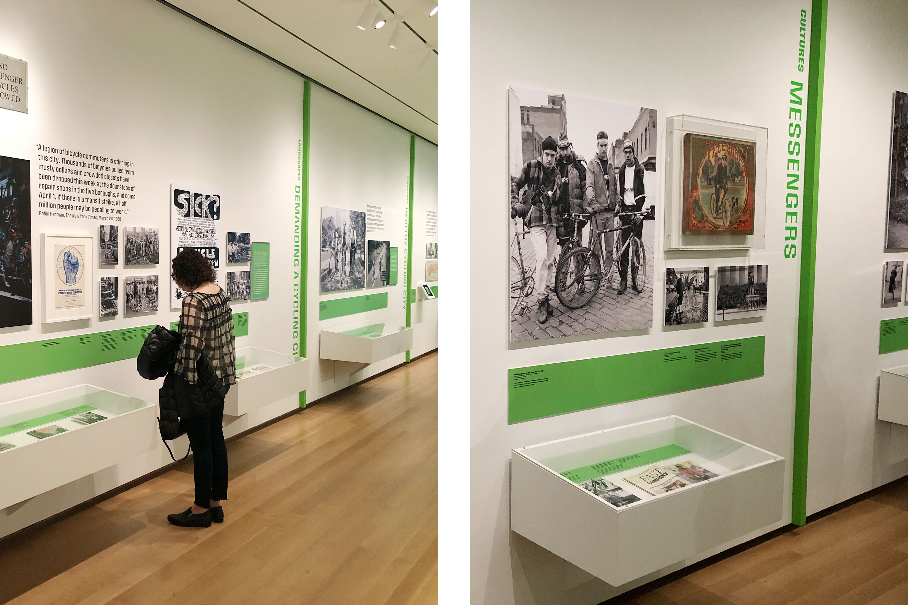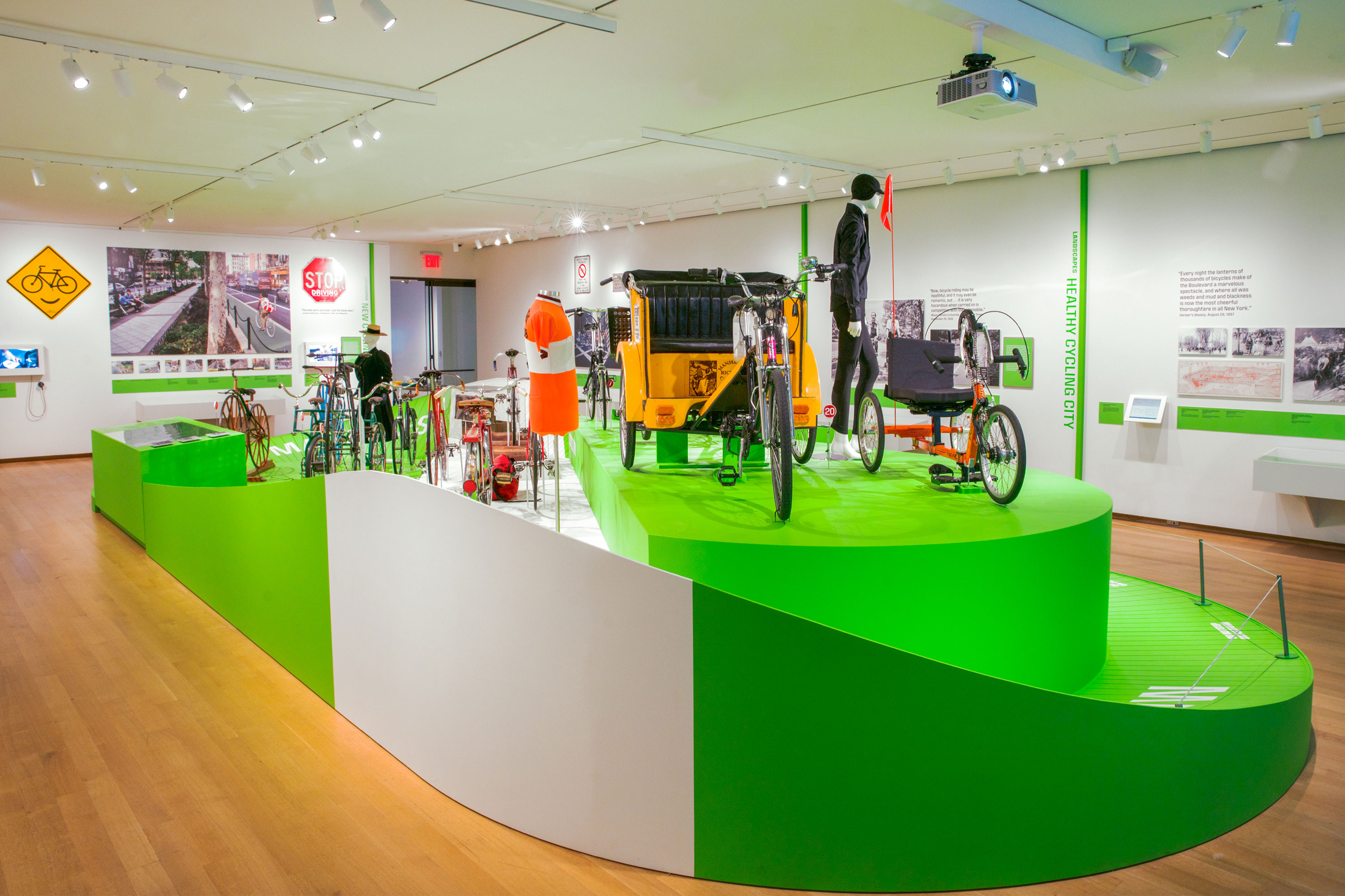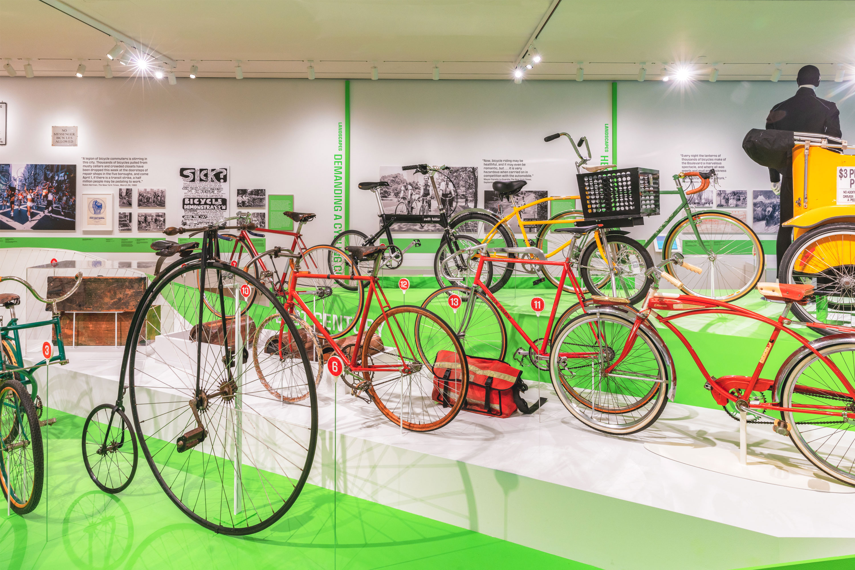 Cycling in the City: A 200-Year History was a temporary exhibition at the Museum of the City of New York which ran from March – October, 2019. The exhibition showcased more than 150 objects which included; bikes, related apparel and printed ephemera which revealed the complex, creative, and often contentious relationship between New York City and the bicycle. Pure+Applied worked with the MCNY team across different elements of the exhibition including; conceptual development, floorplan and elevation design, case layouts, graphic identity and system design, exhibition graphics and installation. The central structure resembles a historic velodrome which showcases the 14 bikes.