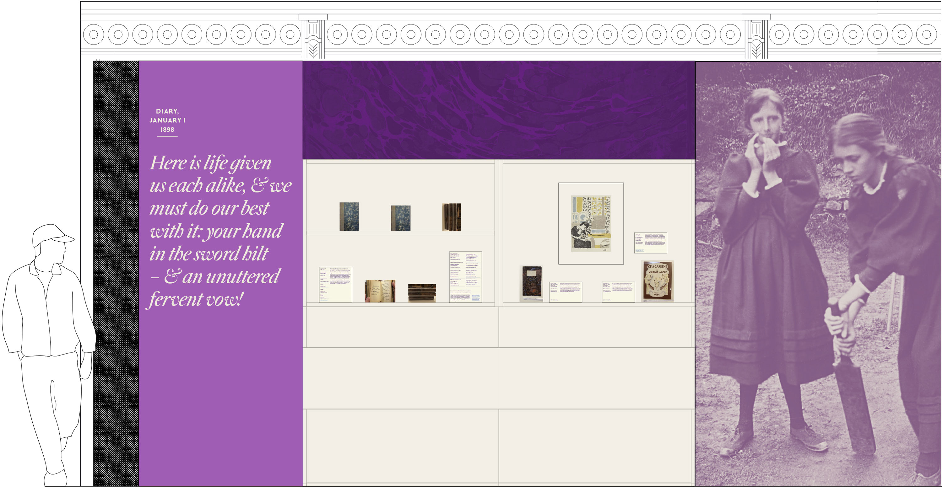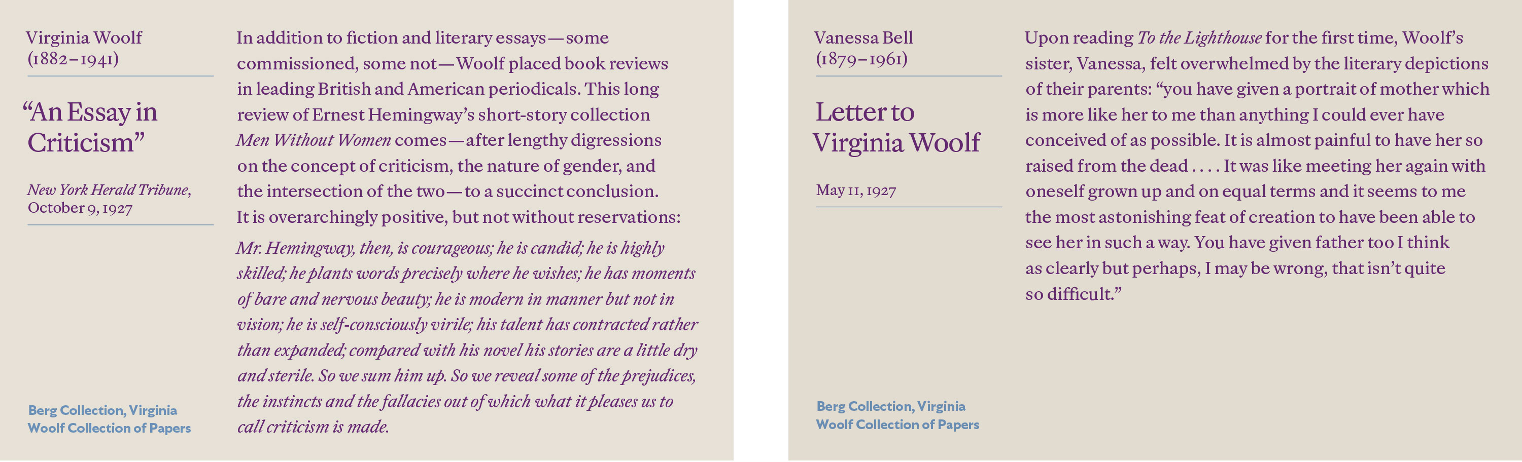 Virginia Woolf: A Modern Mind was a temporary exhibition at the New York Public Library which ran from November 2022 – March 2023. The exhibition provided an intimate view of the author’s life and creative process through her personal notebooks and diaries, family photographs, and unpublished letters. Pure+Applied worked with the NYPL team across different elements of the exhibition including; conceptual development, floorplan and elevation design, case layouts, graphic identity and system design and exhibition graphics and installation.