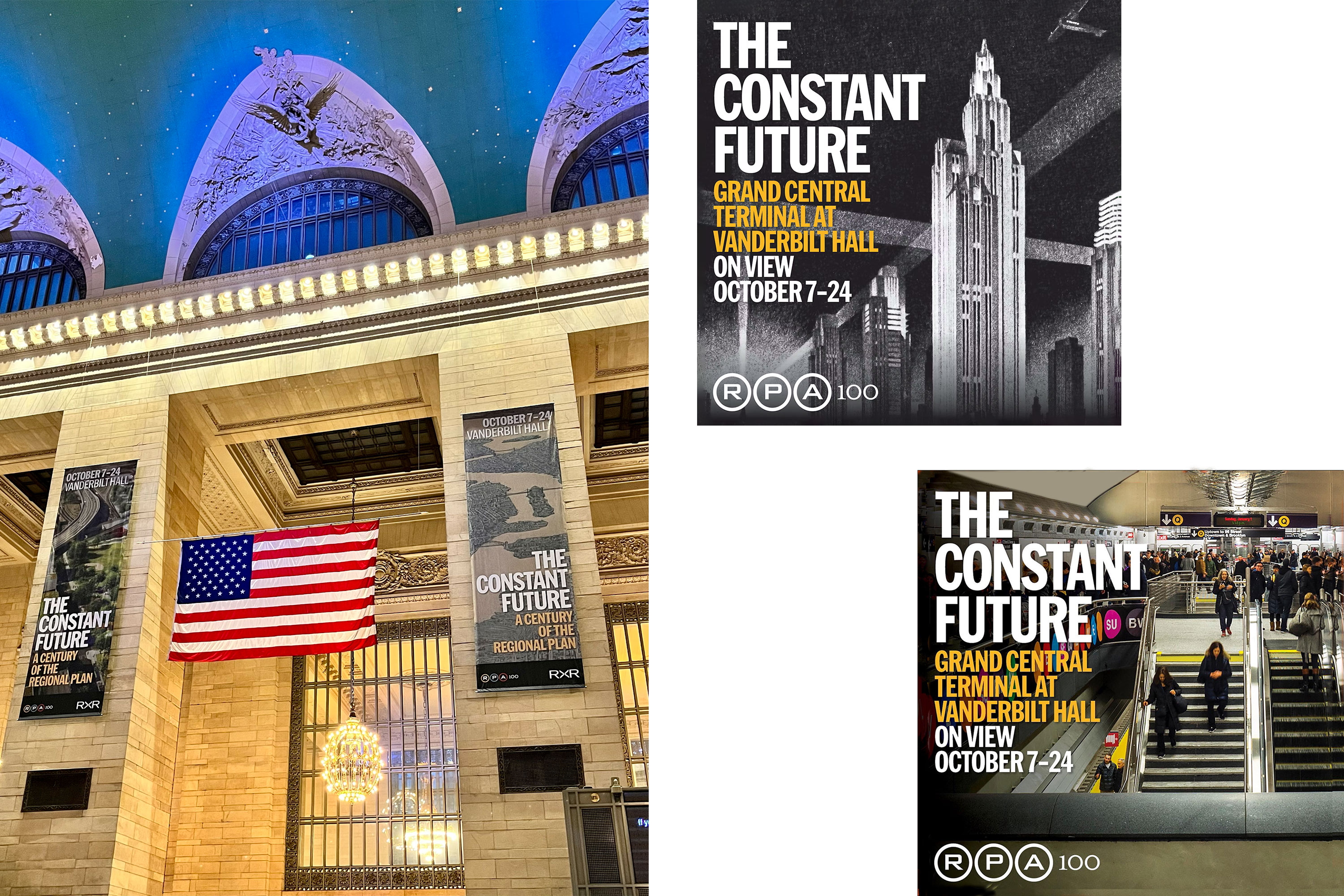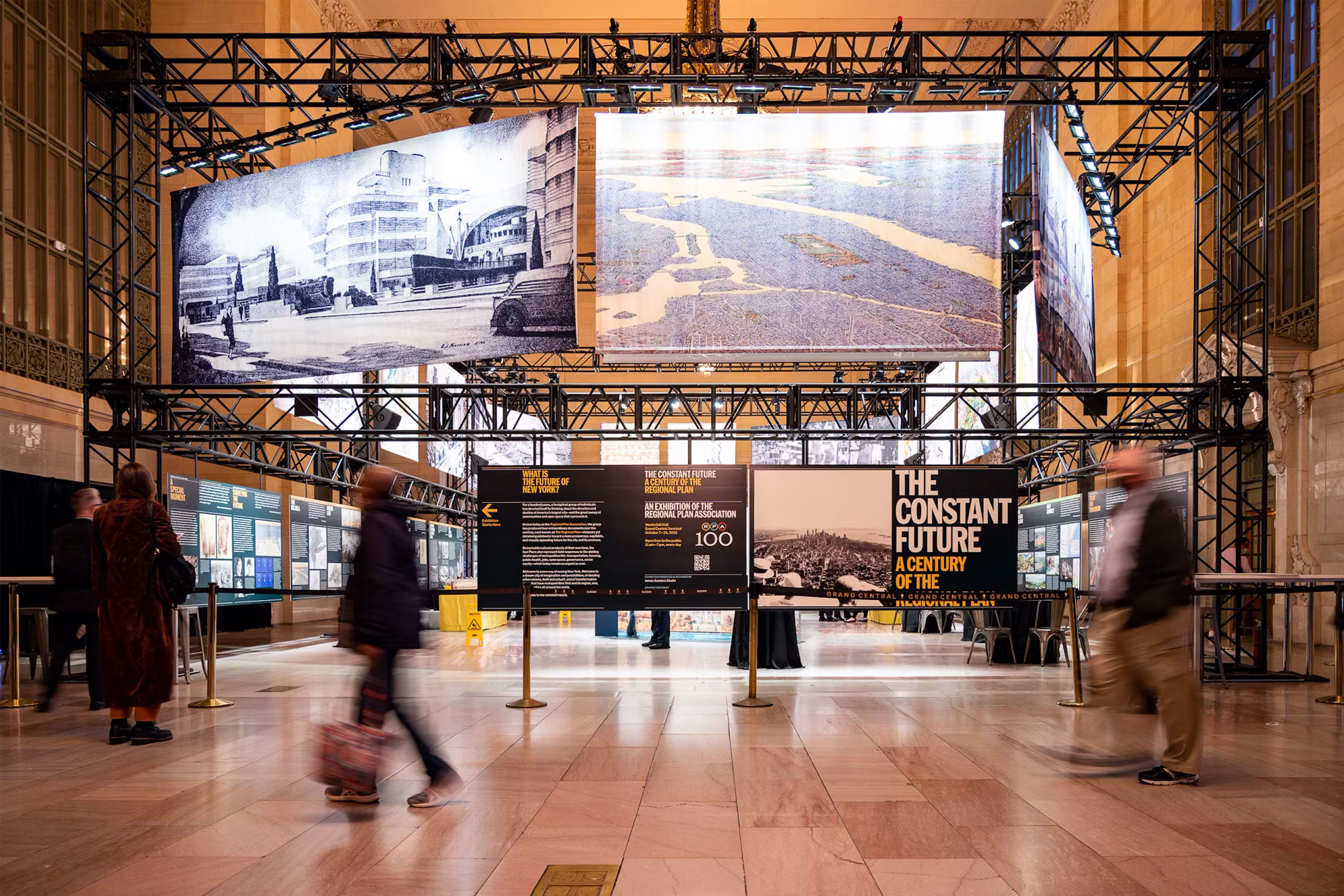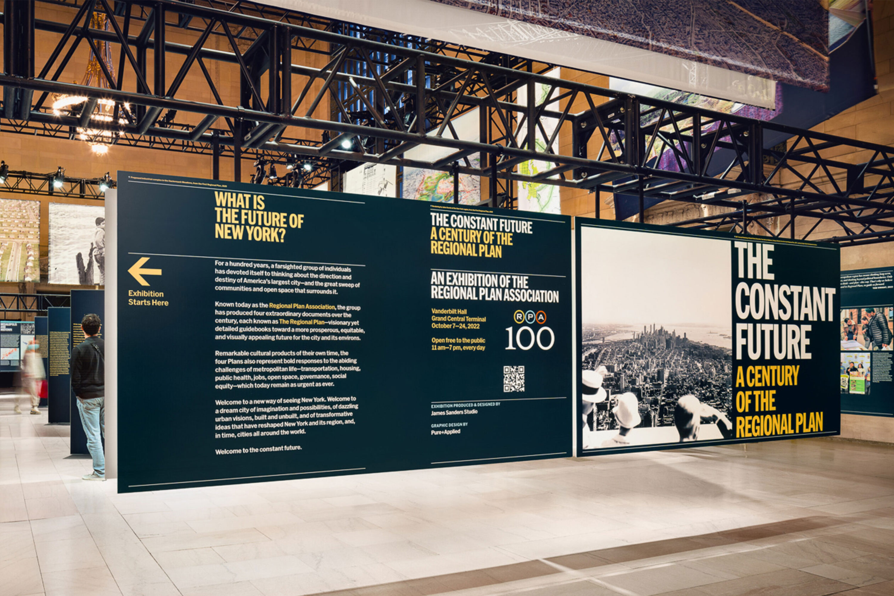 The Constant Future: A Century of the Regional Plan was a temporary exhibition in Vanderbuilt Hall, Grand Central Station which ran for 3-weeks in October 2022. The exhibition celebrated the 100th Anniversary of the Regional Plan, an indispensable source of ideas for policy makers and opinion shapers across the tri-state region and featured dramatic photomurals, large display panels and archival video. Pure+Applied worked with the team across different elements of the exhibition including; graphic identity and system design, exhibition graphics and promotional design. During its 3-week run the exhibition was visited by over 1,200 people a day. This project was a collaboration with James Sanders.