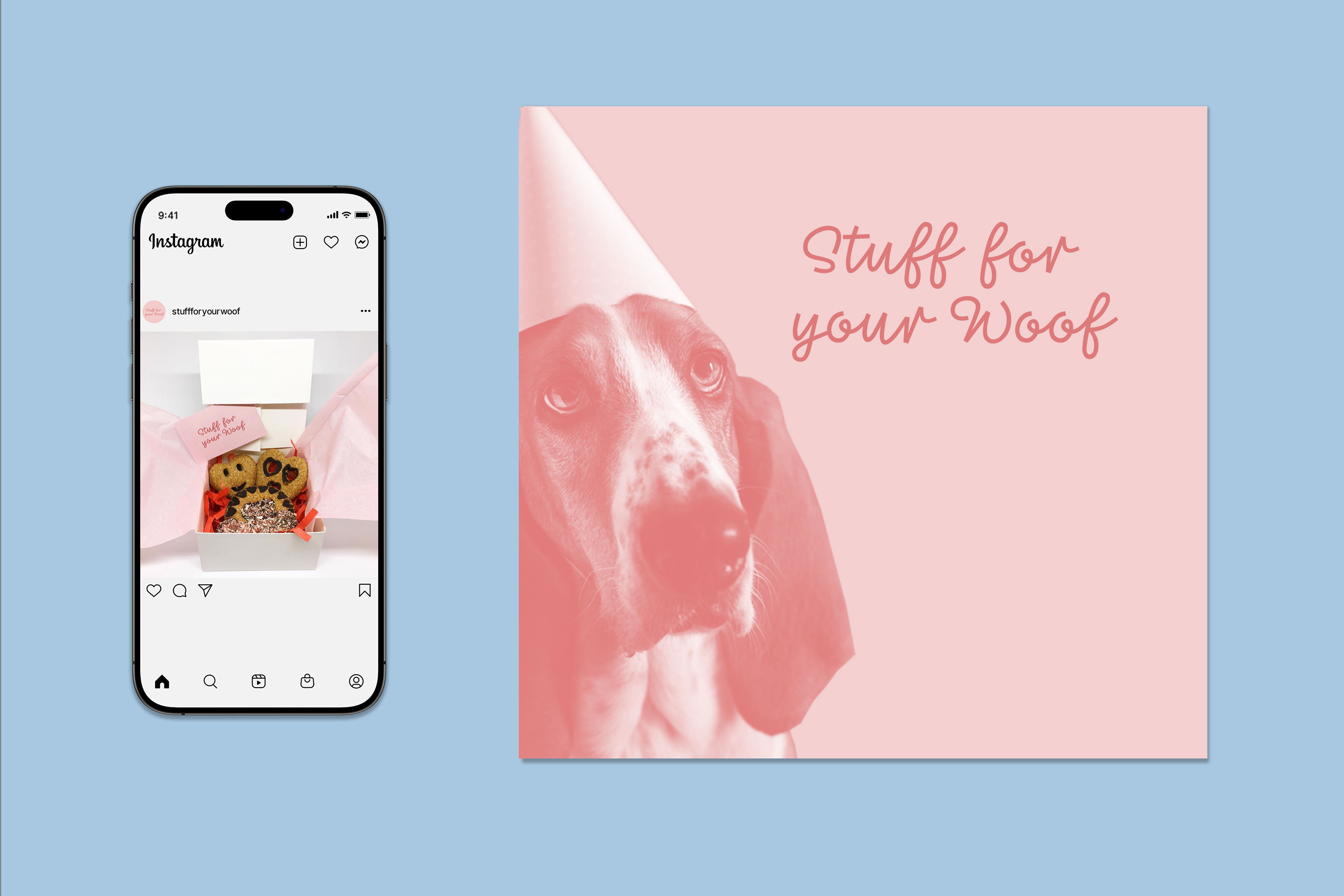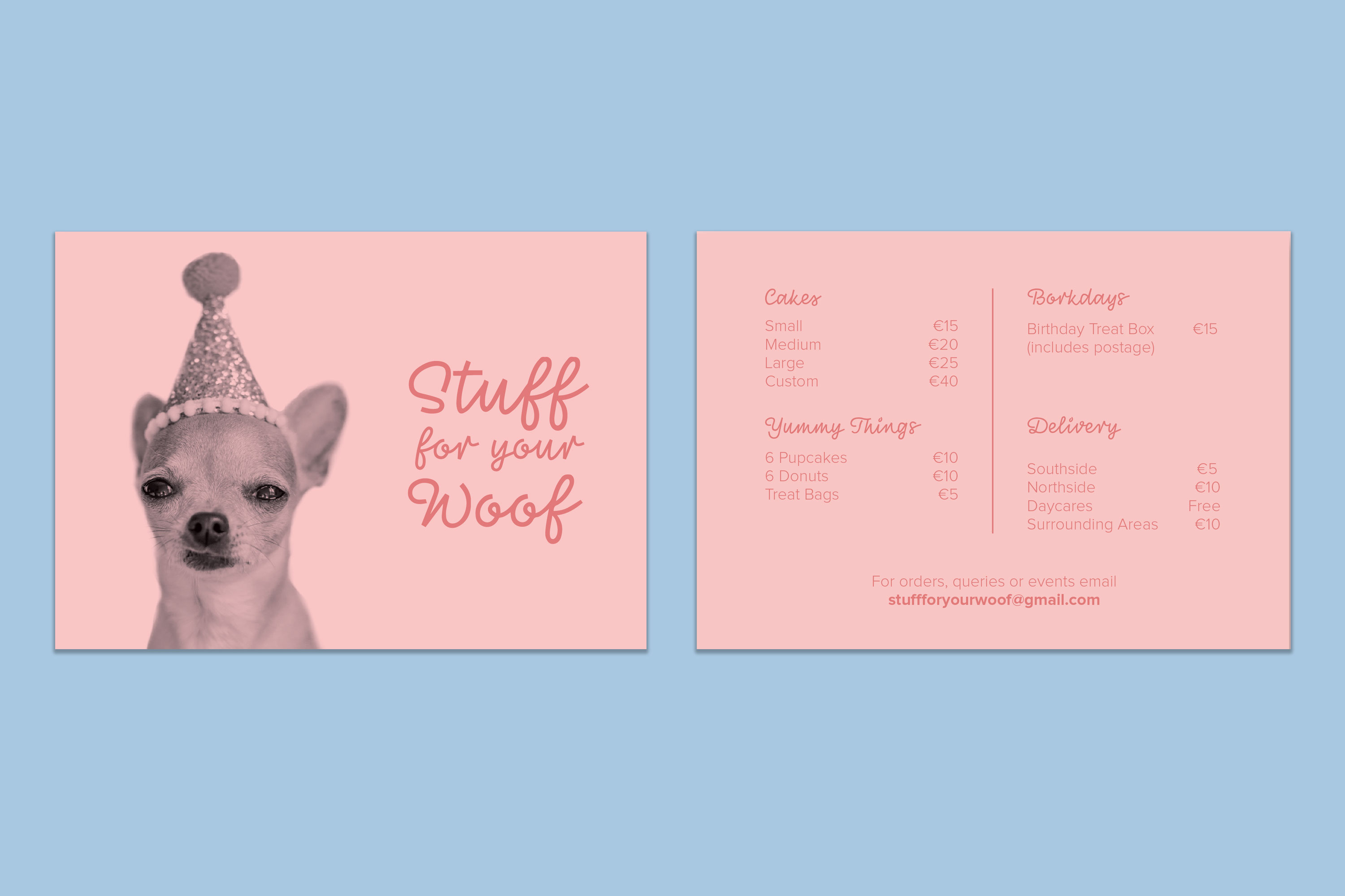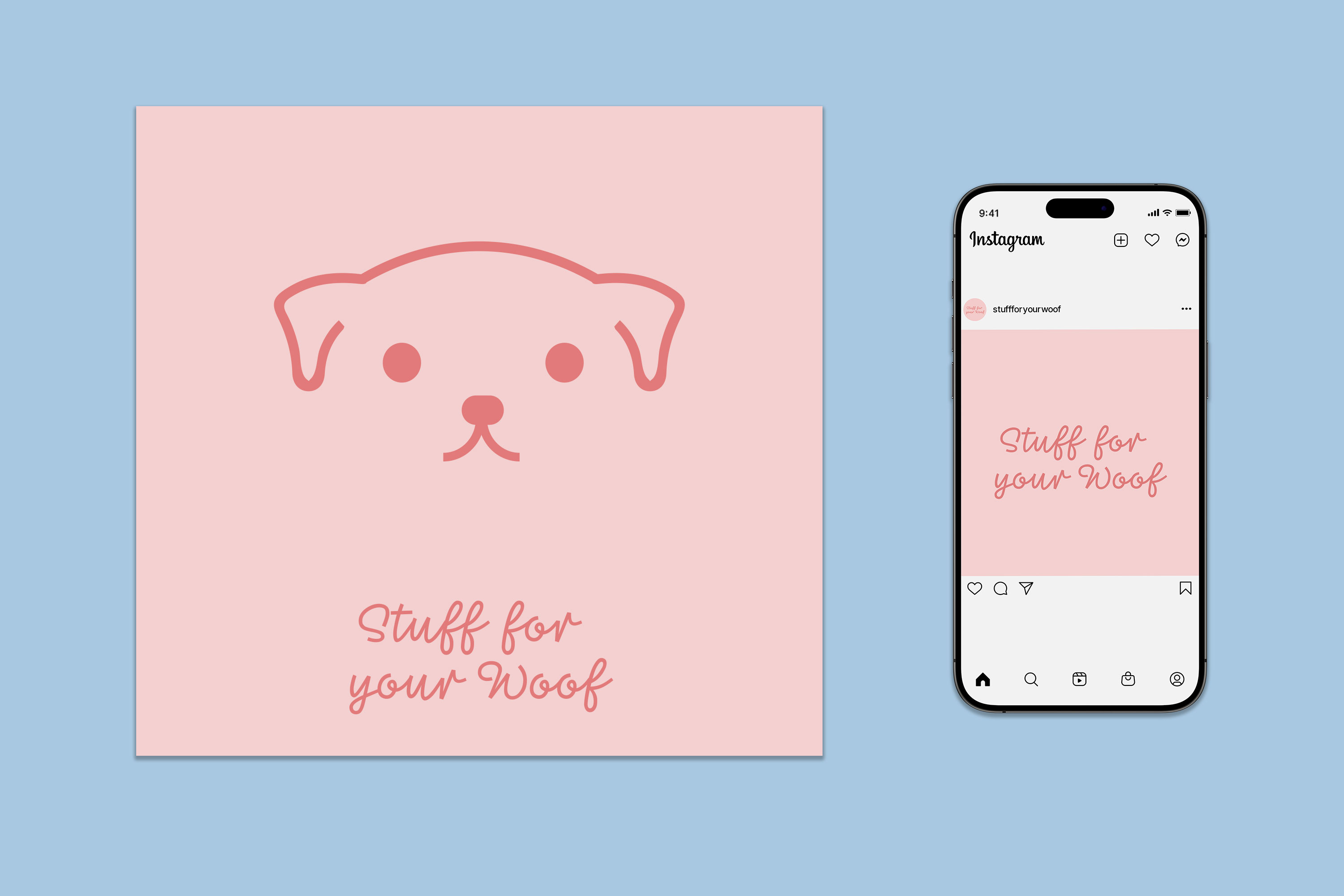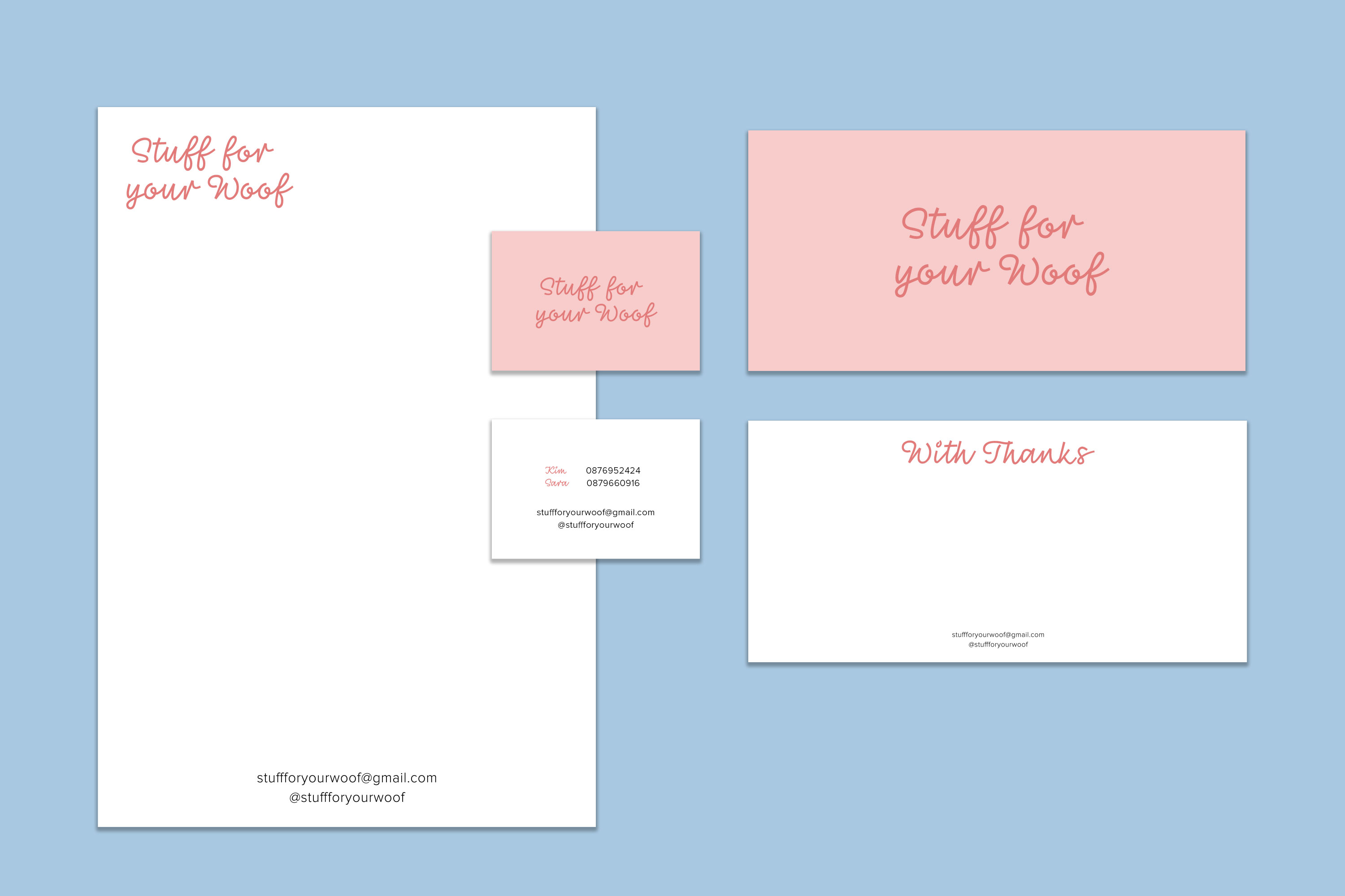 Stuff for your Woof is an Irish company making treats and cakes for dogs. The logo is a simple type treatment to compliment the strong photographic style used to showcase their products. Dog icons were created with interchangeable ears for use on social media and other ephemera and adding to the simple aesthetic.
